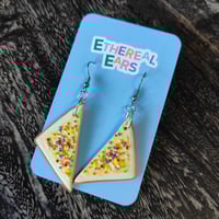 Handmade fairy bread earrings made from polymer clay. Featuring a tasty slice of white bread, creamy butter, and sweet sprinkles! This Australian classic is perfect for any sweet lover.